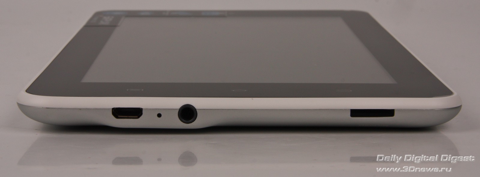 Правый торец содержит классическую кнопку-качели для регулировки громкости. К сожалению, она расположена тоже неудачно низко. Вообще при тестировании складывается такое ощущение, что инженеры попросту хотели расположить три сенсорные клавиши на противоположной стороне планшета, но что-то перепутали, и поэтому они находятся так близко к боковым кнопкам.