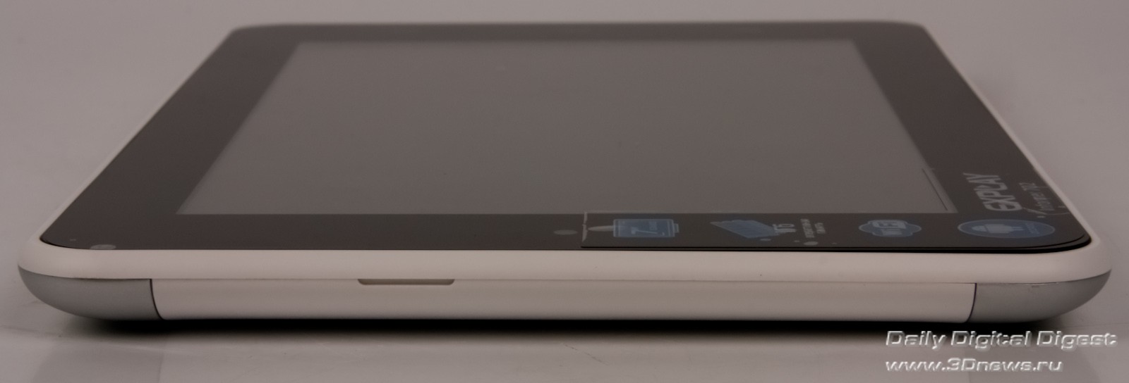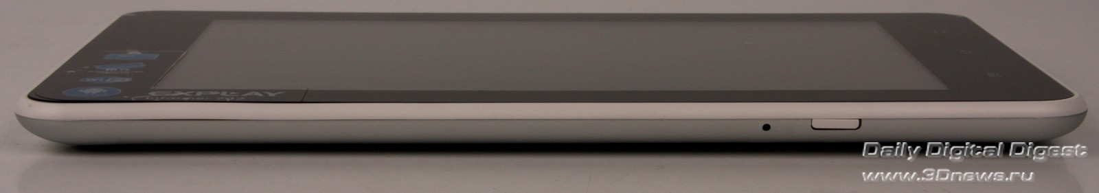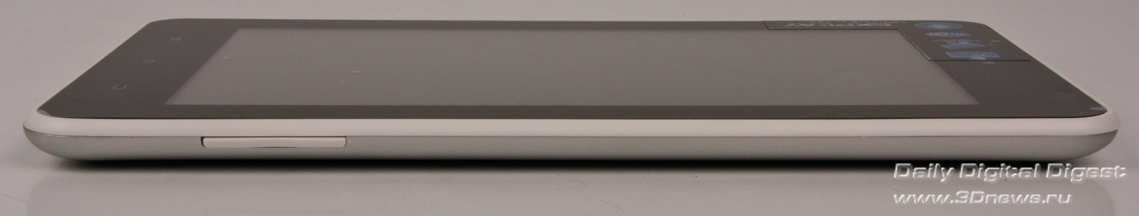 На левом торце планшета спряталась кнопка включения/выключения устройства. Её следовало бы расположить выше — когда держишь планшет вертикально, к ней неудобно тянуться. Кстати, Informer 702 довольно тонкий. Толщина устройства составляет 10 мм.