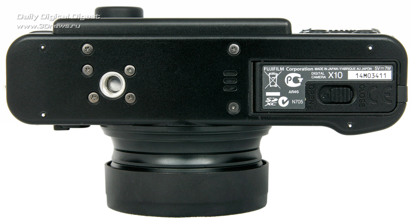 Снизу находится штативный разъём, системный динамик и дверца, скрывающая отсеки установки карты памяти и аккумулятора.