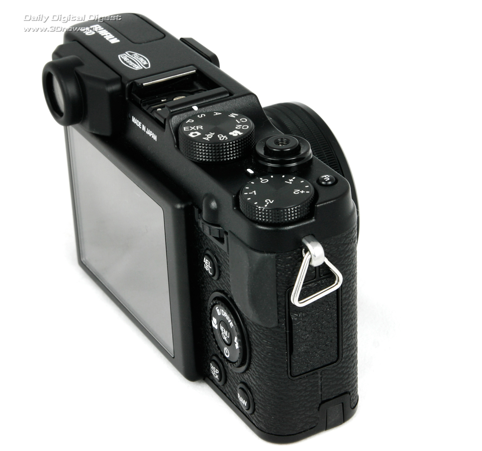 перехода в режим просмотра, как это реализовано во многих компактах.Также спереди расположены пара микрофонов, очень яркая лампа подсветки автофокуса, которая также является индикатором таймера автоматического спуска затвора, и круглый рычажок выбора режима работы фокусировки (покадровый и следящий автофокус, а также ручной режим). Забегая вперёд, отметим, что ручная фокусировка осуществляется при помощи кольца вокруг круглой многофункциональной клавиши, а отдельного кольца на объективе не предусмотрено.