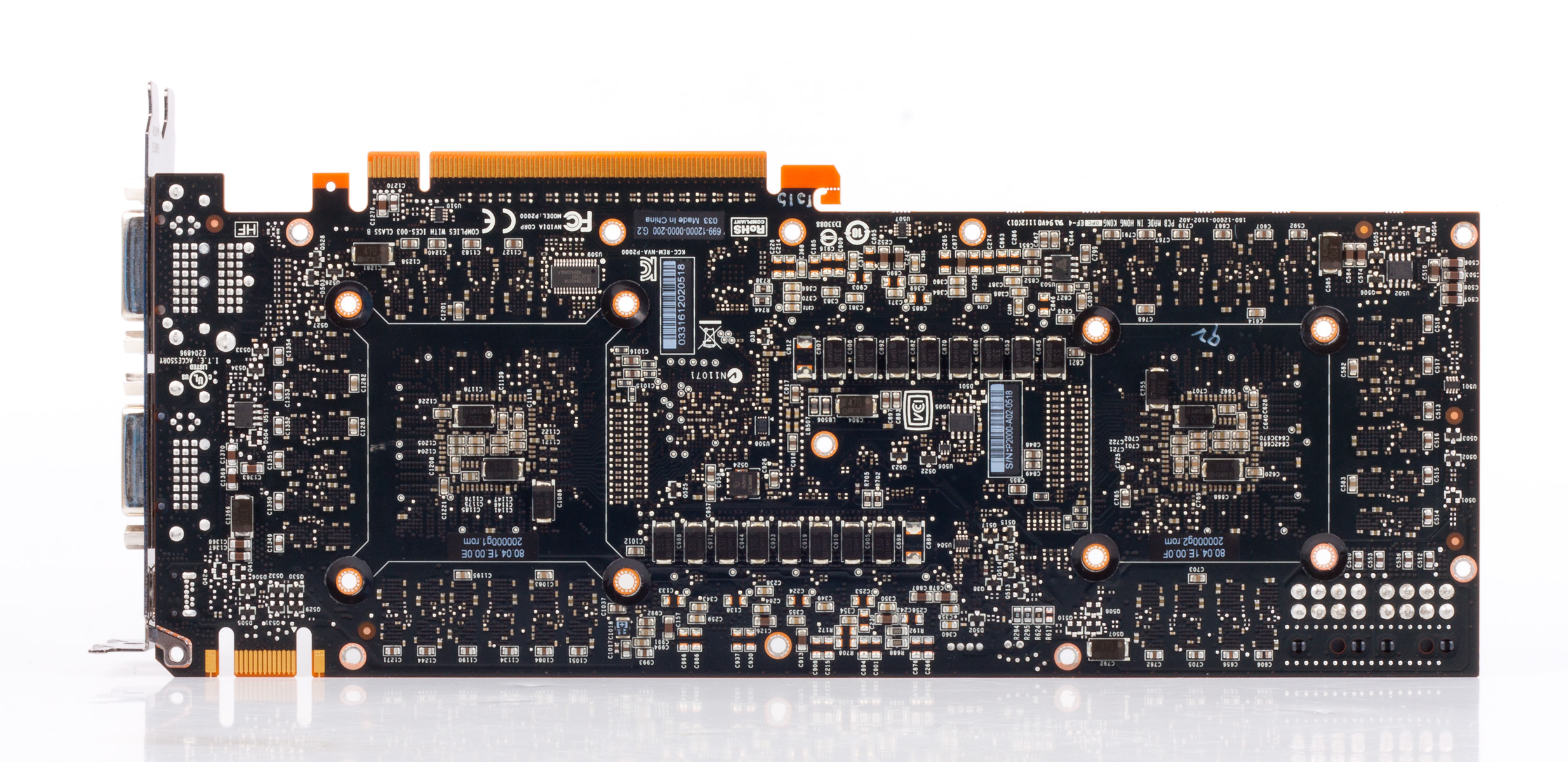 GTX 690 построен на 10-слойной плате. Все микросхемы памяти поместились на передней поверхности.Как и GeForce GTX 590, GTX 690 комплектуется микросхемами памяти Samsung (GTX 680 – Hynix). Номинальная частота такая же, как и у GTX 680: 6 ГГц, маркировка — K4G20325FD-FC03.