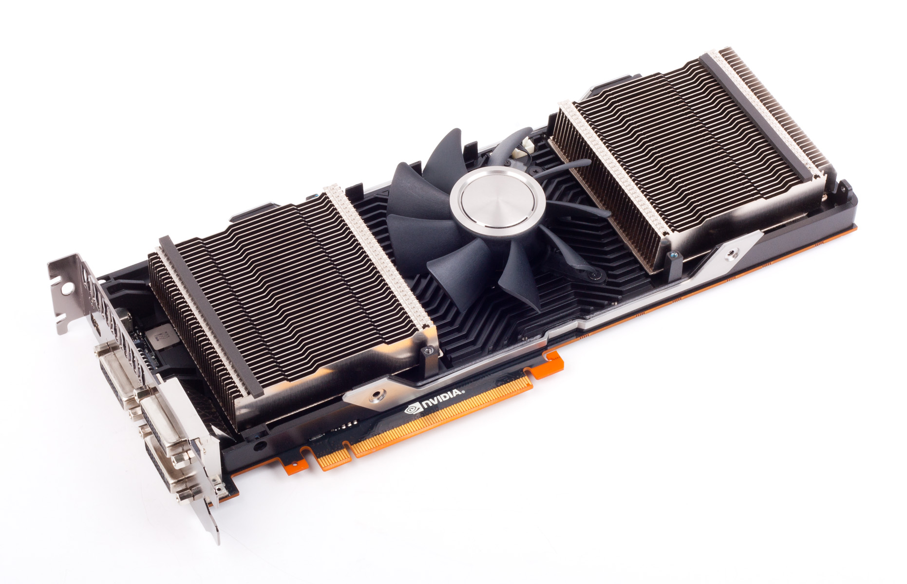 Дизайн системы охлаждения в целом повторяет то, что мы видели на GeForce GTX 590: графические процессоры охлаждаются двумя отдельными радиаторами с медной испарительной камерой. В центре находится крупный вентилятор, разгоняющий воздух по сторонам. Как следствие, часть «выхлопа» из видеокарты попадает внутрь корпуса компьютера. NVIDIA утверждает, что материал крыльчатки кулера и угол наклона лепестков подобраны таким образом, чтобы минимизировать шум.