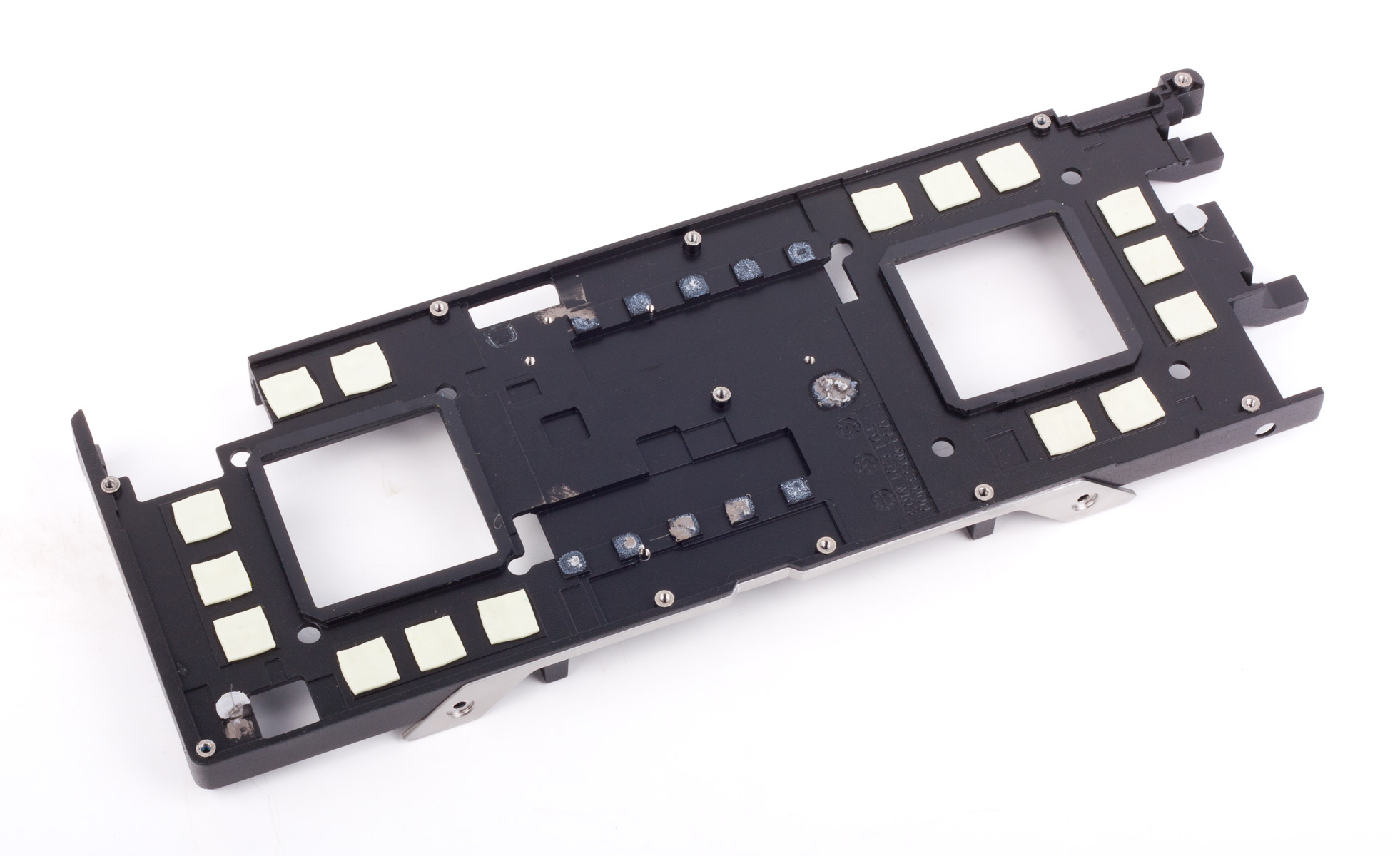 Микросхемы памяти и элементы питания платы охлаждаются с помощью массивной алюминиевой рамы. В отличие от GTX 590, на GTX 690 все навесные элементы платы уместились под рамой, нет никаких вырезов для высоких конденсаторов. От вентилятора к концам платы идут ребра, направляющие воздушный поток. Пластин на задней стороне платы нет.