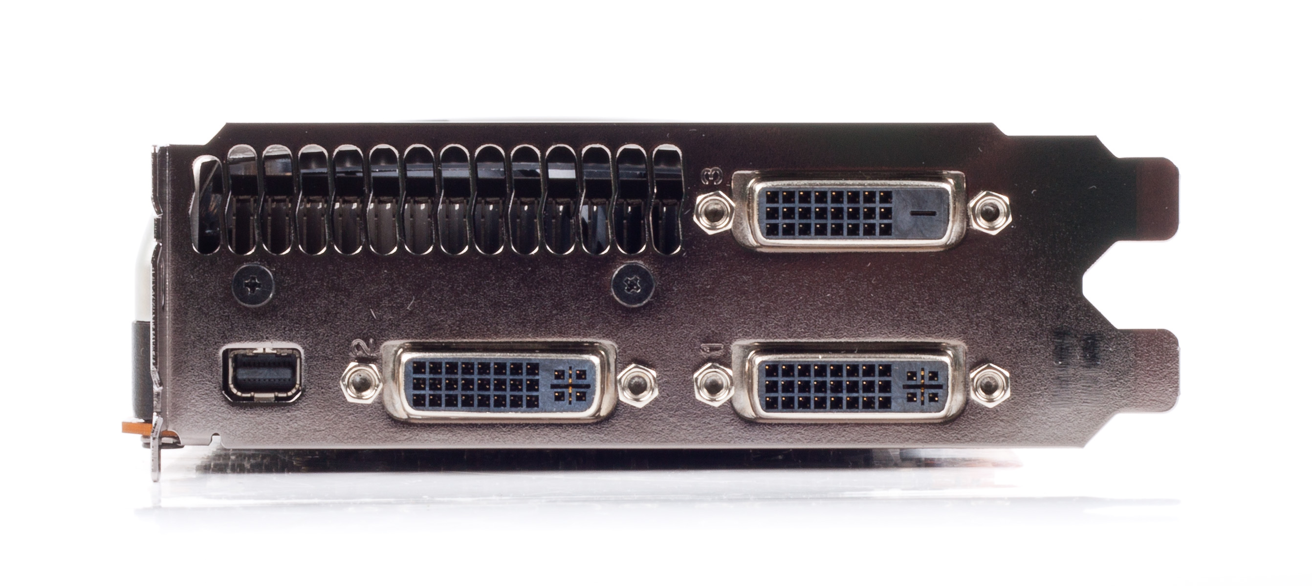 Порты на задней панели тоже расположены немного не так, как у GTX 590: один из выходов DVI больше не стоит в середине планки, преграждая путь воздушному потоку, а смещен в сторону.
