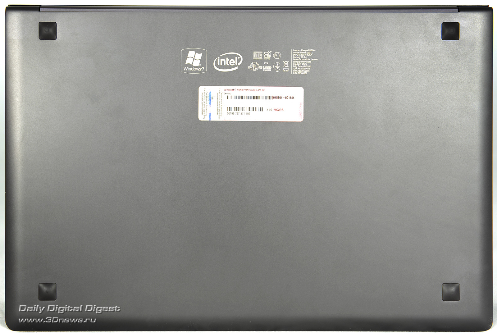 Внешние стороны папки или книжки, которую явно имели в виду дизайнеры при разработке экстерьера IdeaPad U300s, окрашены в чуть более темный оттенок серого, чем внутренние поверхности. Потертостей и мелких царапин ноутбук не боится. Пачкается он с разных сторон по-разному: рабочая область не страдает от отпечатков пальцев, а вот днище и крышка собирают их довольно быстро. Одно хорошо — оттираются они без особых усилий.