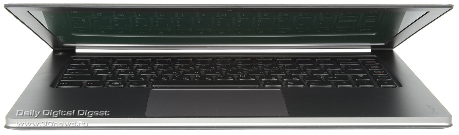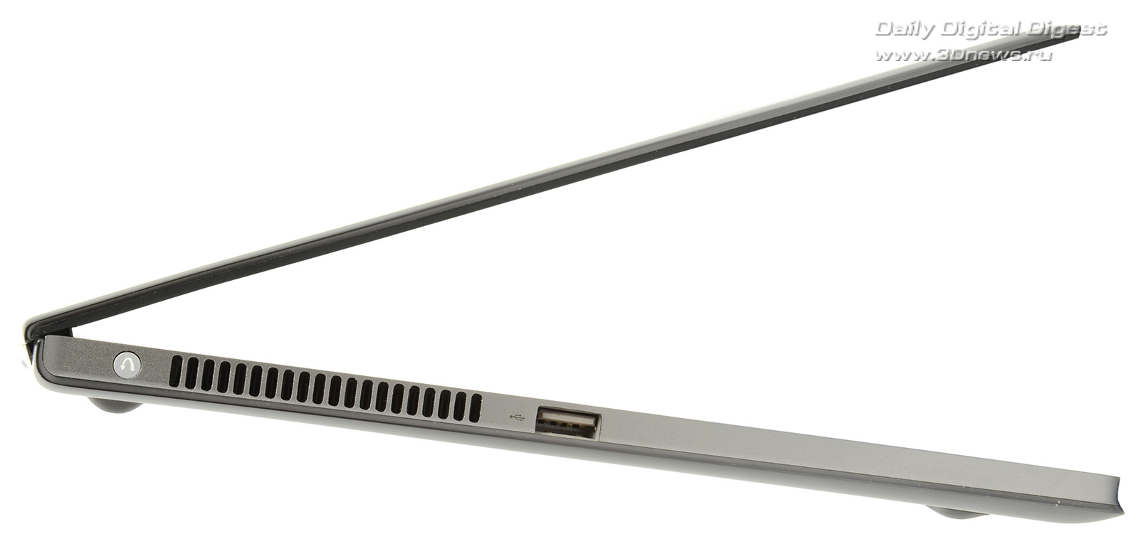 На передней стороне ультрабука находится только пара светящихся пиктограмм питания и состояния аккумулятора. Яркость свечения пиктограмм оптимальна: они не мешают при работе в темноте, но хорошо заметны днем даже при ярком солнце.