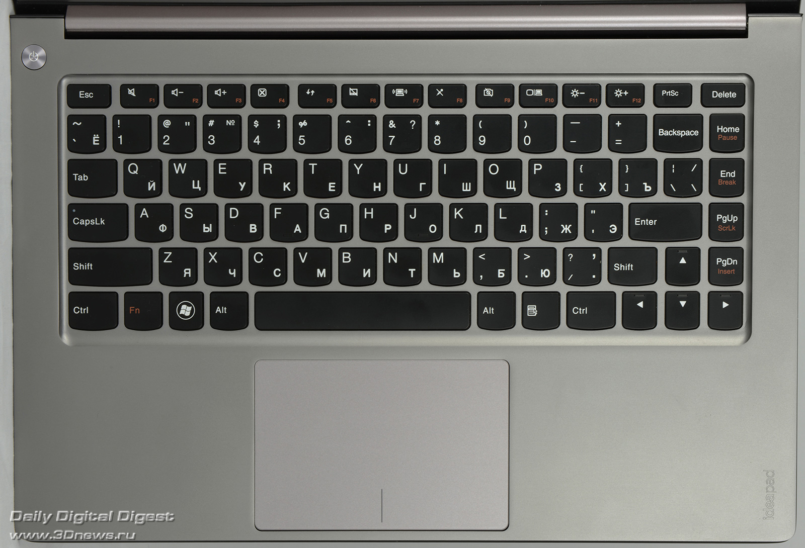 Клавиатурный блок стандартный для ноутбуков Lenovo IdeaPad. Это клавиатура островного типа с клавишами характерной скругленной снизу формы. Несмотря на небольшие размеры корпуса, многострадальная клавиша [ё] не была ужата. Немного пострадали лишь клавиши-стрелочки, ширина которых была уменьшена до 13,5 мм при ширине стандартной литерной клавиши 15 мм.