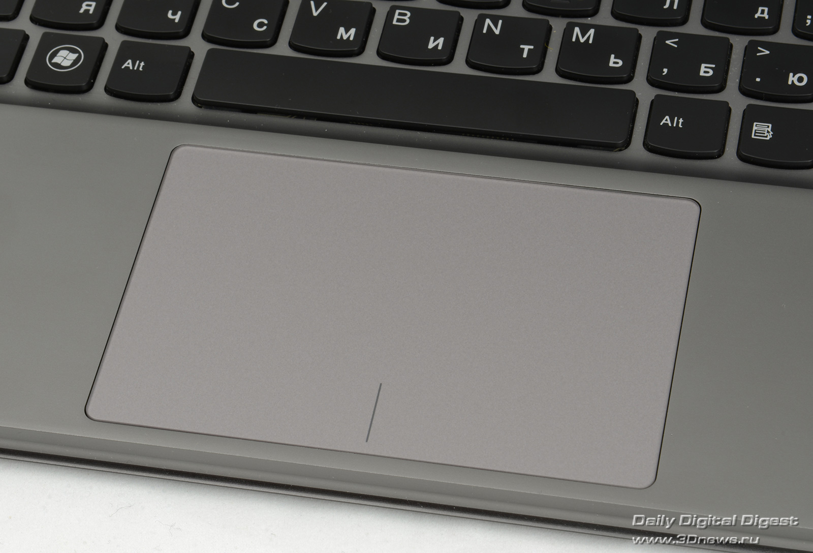 Сенсорная панель «бескнопочная»: часть чувствительной области отведена под виртуальные клавиши манипулятора. Выглядит это красиво и увеличивает площадь панели — тачпад получился очень просторным, его размеры составляют 105х70 мм. Но есть и другая сторона медали — клавиши манипулятора нажимать не слишком удобно, к тому же щелчок срабатывания слишком уж заметен, что особенно выделяется на фоне практически бесшумной клавиатуры.
